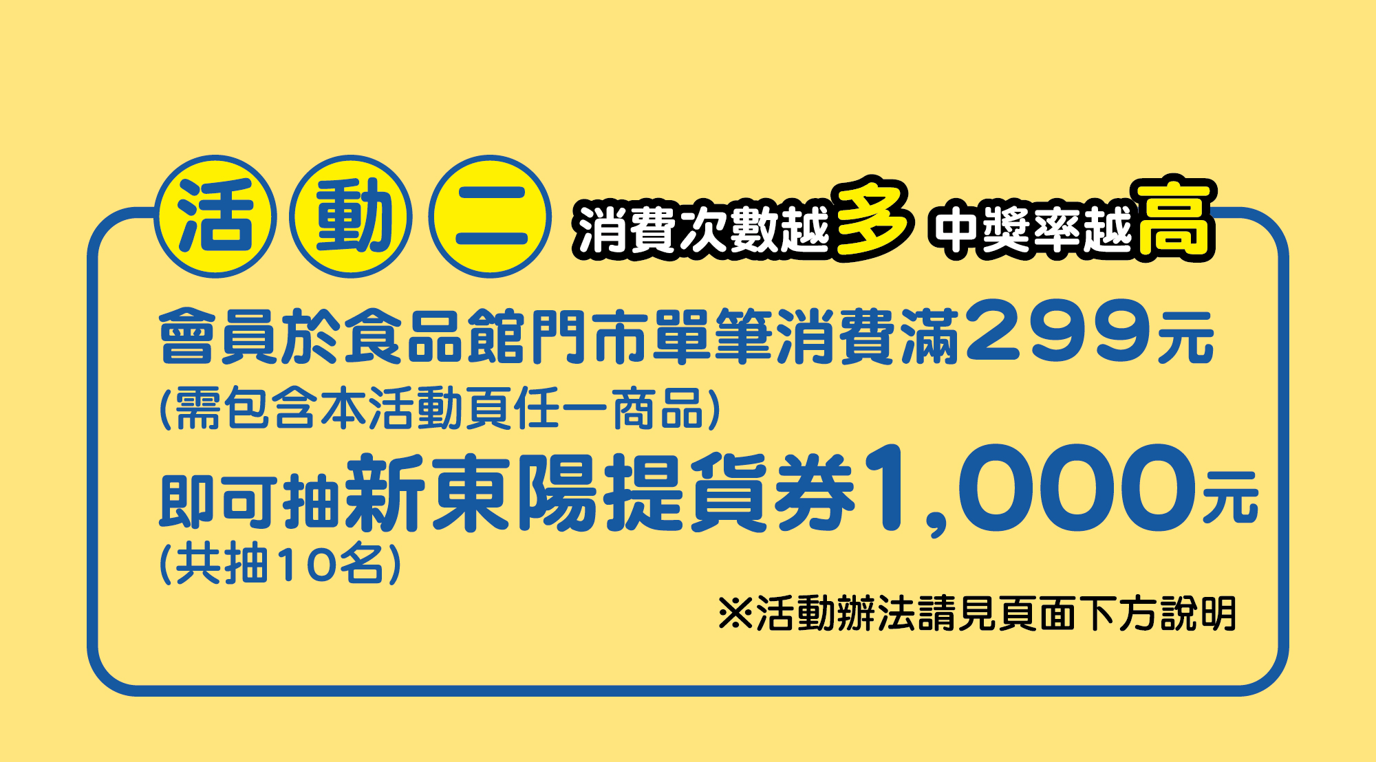 - 參加者限中獎一次,本活動將於2023/9/8(五)在「新東陽官方網站」公告中獎名單,並於2023/9/29(五)前依參加者於註冊會員時所填寫之地址寄出獎項。